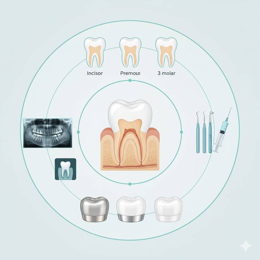 Restoration costs following the root canal are equally important and often overlooked in initial estimates. After the nerve is removed, the tooth becomes more brittle and requires protection. A dental crown (cap) typically costs $1,000-$2,500 depending on material: full-metal (least expensive), porcelain-fused-to-metal ($1,000-$1,500), or all-ceramic/zirconia ($1,200-$2,500). Some teeth, particularly anterior teeth with minimal prior decay, may be restored with a permanent filling instead of a crown ($150-$450), but this is less common for posterior teeth that bear chewing forces. The core build-up—filling material placed inside the tooth to support the crown—adds another $200-$500 if substantial tooth structure is missing.